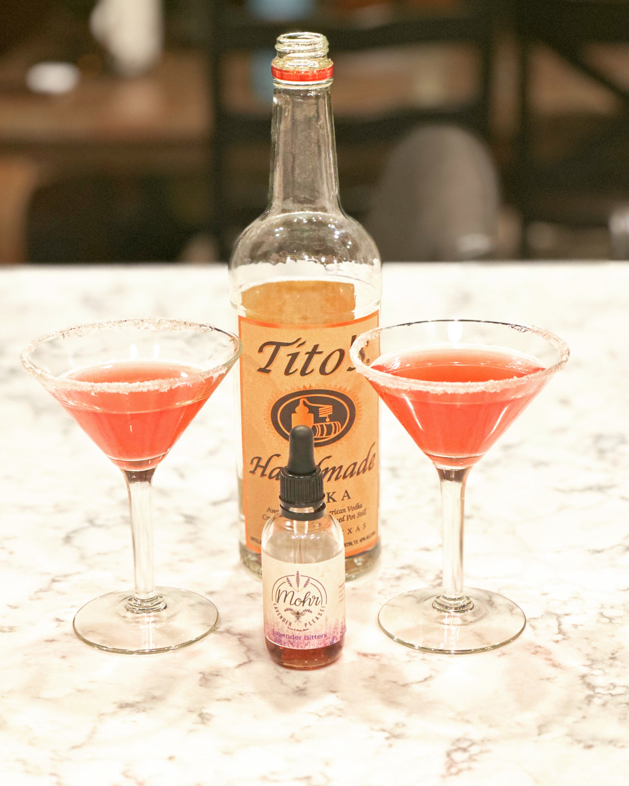 2oz cranberry juice1/2 lime juice2oz of vodka1/4 tsp lavender bitters lavender sugar Rime martini glass with lavender sugar. Mix the first 3 ingredients together and pour in the prepared glass....